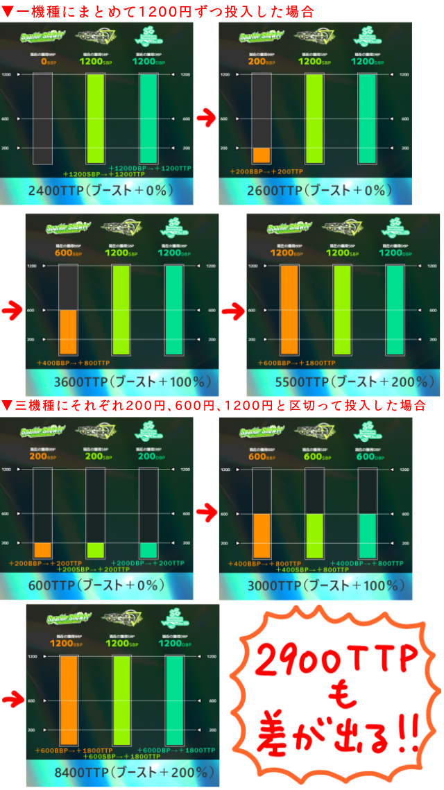 200SBP加算で一回区切れば、ブーストMAXまでに加わる1,000TTPは+100%が加算されて2,000TTP入ることになる。600SBPで区切れば残りの400TTPも以下同文。