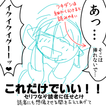 絵が描ける人は、絵で表現したほうが読者にも伝わりやすいです。どうしても細かい場面を表現したいなら、手抜きせずに2枚目、3枚目とシーケンスを描くべき。